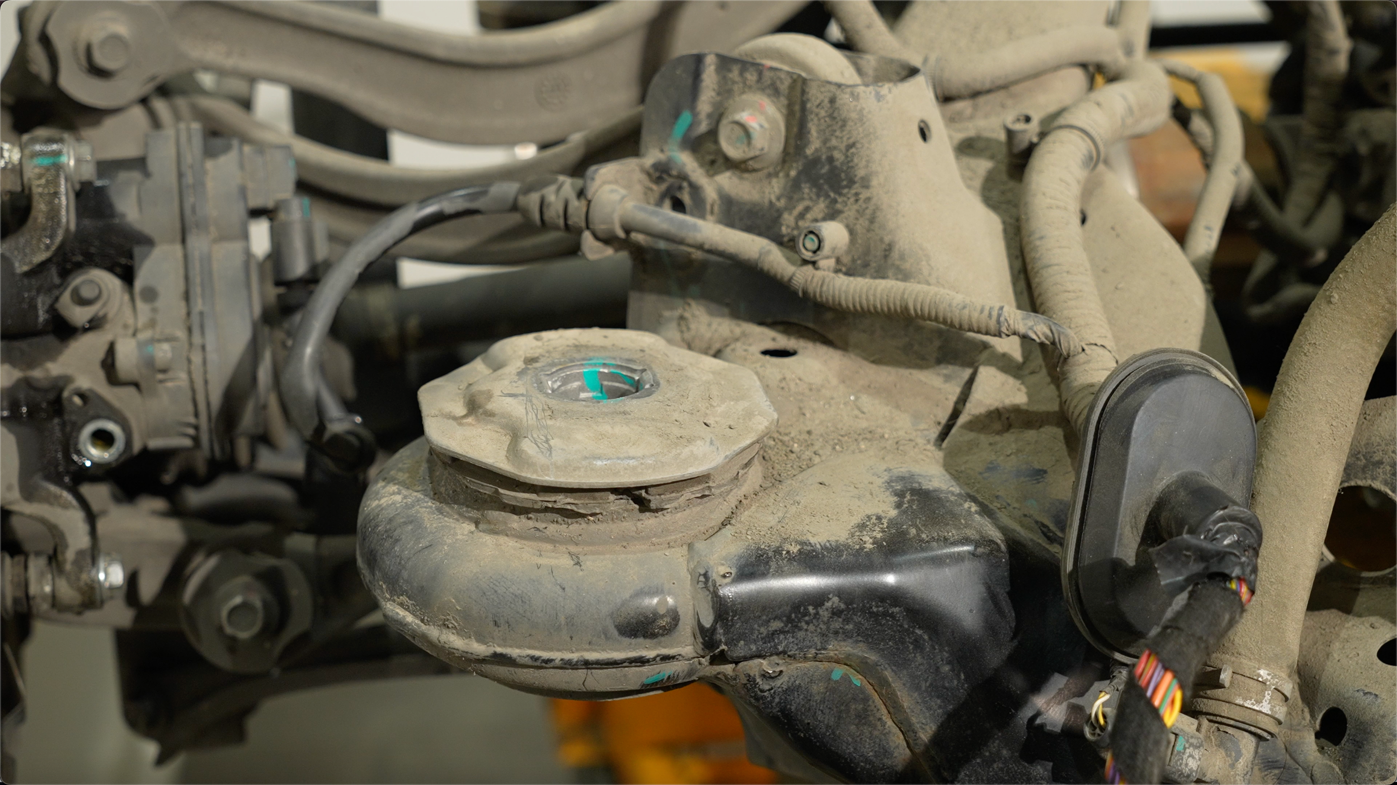 另外,这次拆解我们还能看到一个不容易被发现的技术,就是这个副车架和车身的连接点,他们这里叫做多次冲压一体成型的一个支座技术,这个技术是零跑的一个独家专利,能保证很好的强度和定位精度,其实零跑后副车架也是类似的专利只不过改成了柔性的衬套连接,这八个点,在38万公里的行驶中没有发现肉眼可见的失效。我觉得还是不错的一个拆解结果。接下来我们看一下悬架。