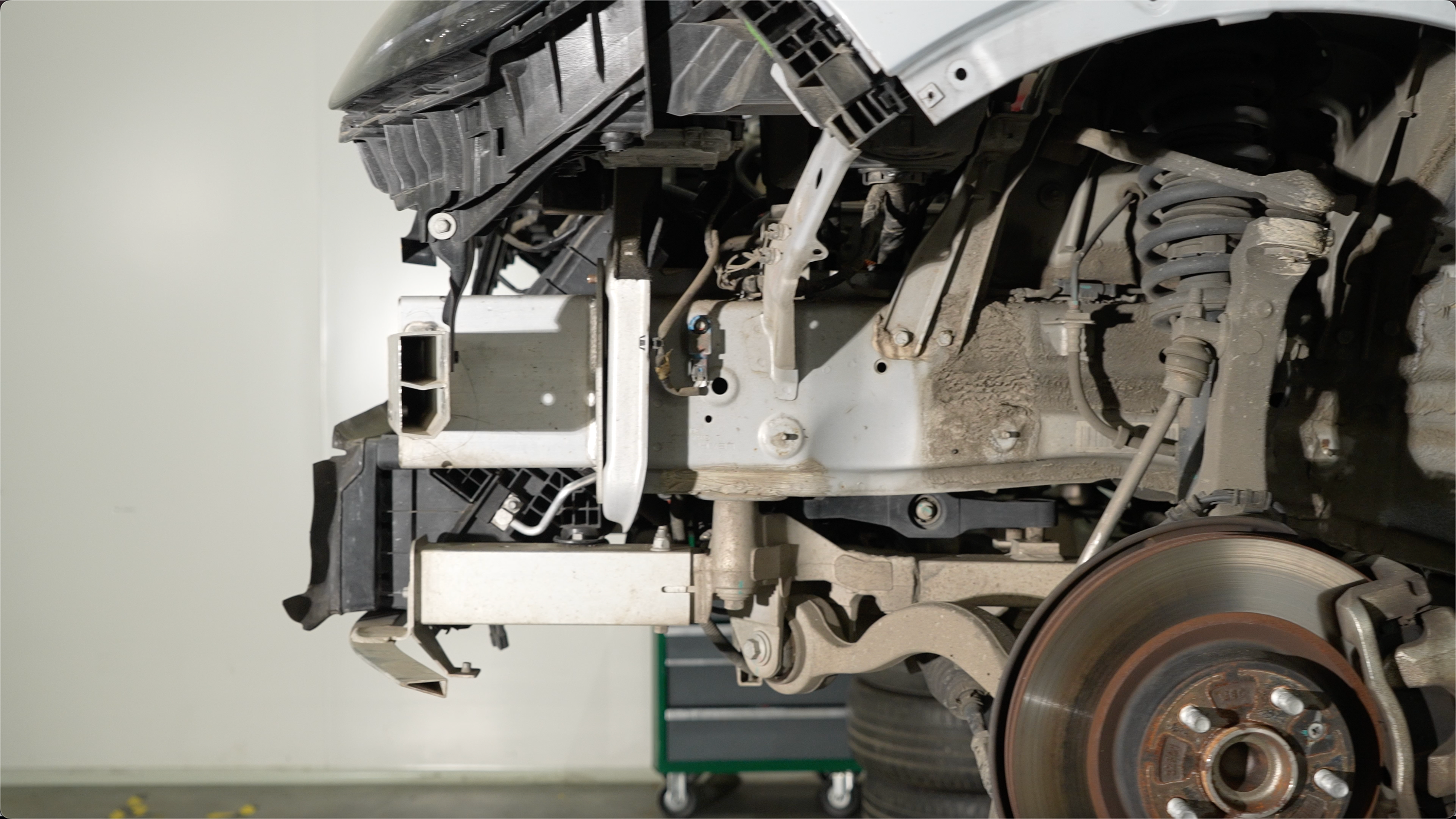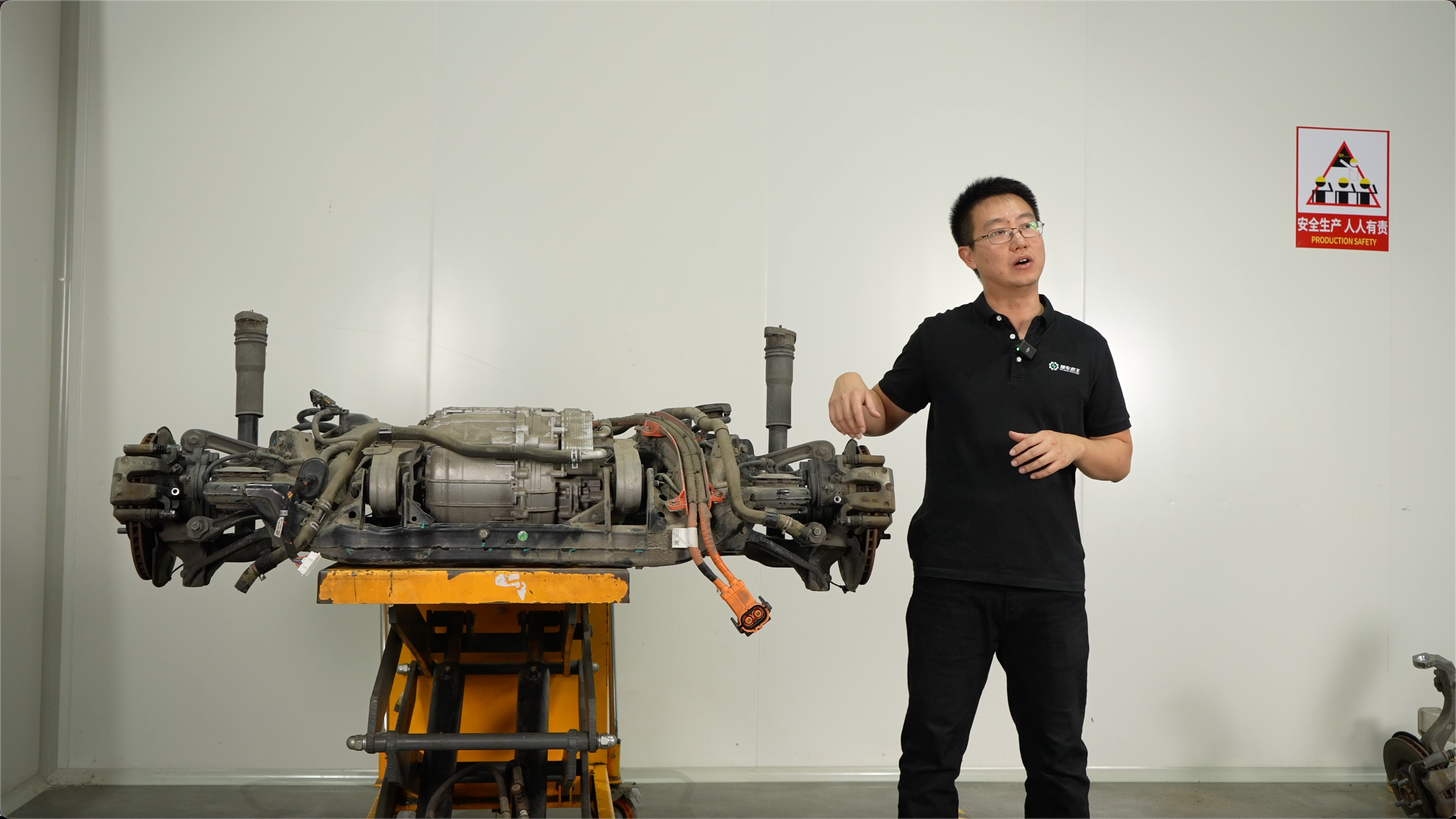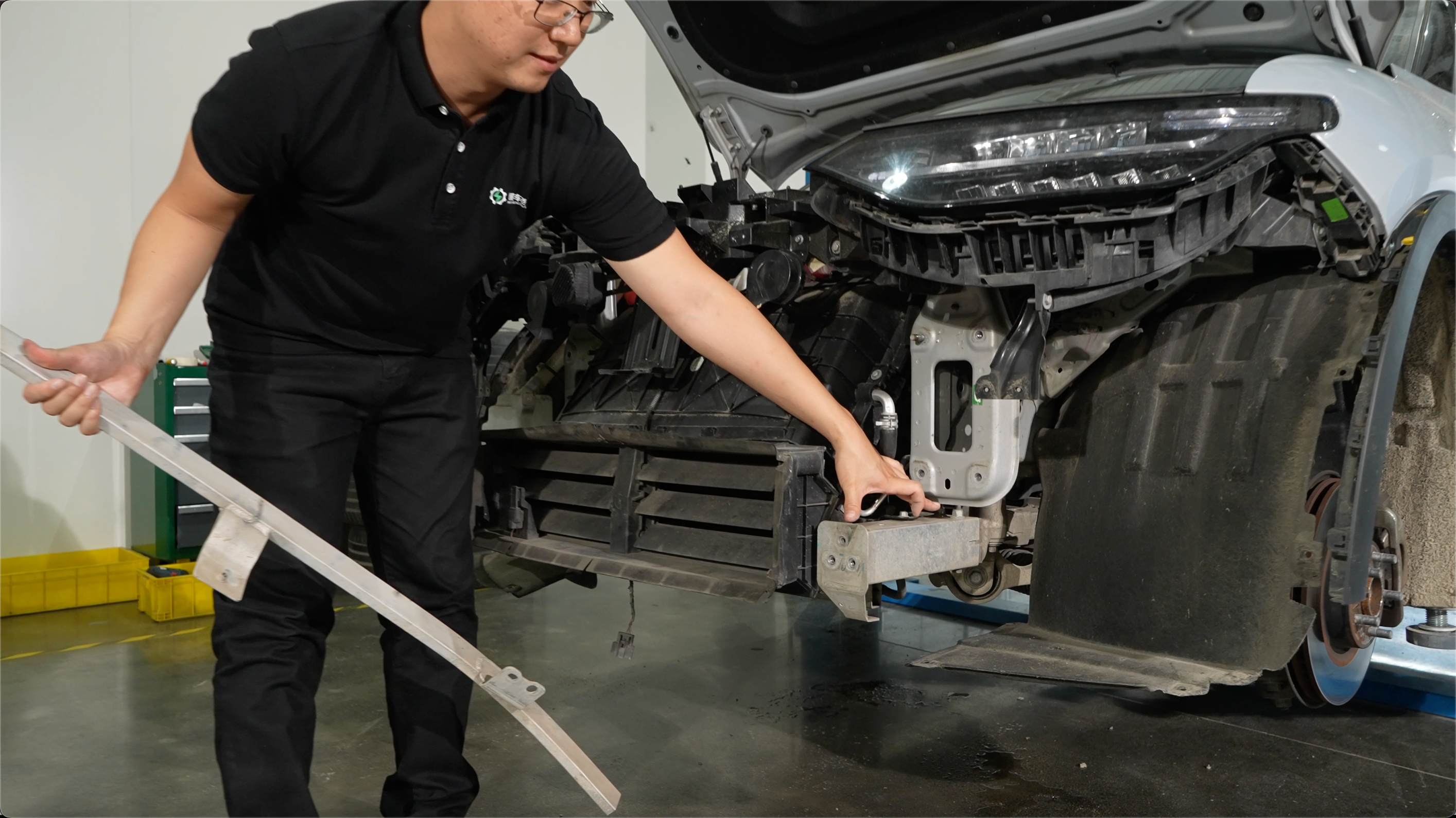 防撞梁与纵梁梁体的传力结构这里有三条力学传递路径,一个是防撞梁——纵梁到防火墙,第二条是从上纵梁到A柱,第三条其实更有特点,我身后这个是已经拆掉了,我们看一下拆之前的画面,大家可以看到,其实在防撞梁下方还有一个副梁,由中间的吸能盒连接下方的副车架,这里的吸能盒是可以拆解的,所以这辆车是把底盘的这第三条传递路径做的比较通畅的。
