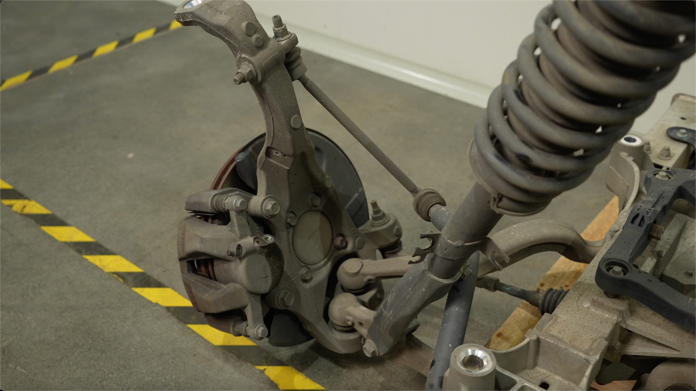 这辆车表显行驶了38万公里,目前我们看了一圈,连杆连接的衬套没有异常变形的,减振器暂时也没有漏油的迹象,转向的框量也比较小,之前我们测试耐久工况,极端情况有的车1千公里就漏油了。悬架系统,全拆之后大家看的非常清楚,前悬架零跑C11是一个转向拉杆在前,制动卡钳在后的这么一个形式,搭配的是DP-EPS就是双小齿轮的转向助力,电机是奔驰同款的Nidec助力电机,这种双小齿轮的结构就是一个小齿轮在输入轴,另一个在输出轴上进行助力。客观来说,汽车行业普遍的观点是双小齿轮的DP-EPS比C-EPS要好很多,但和R-EPS还有一定距离。 前悬架这辆车上叉臂是一体化的,下叉臂采用解耦连杆的形式,这是双叉臂的一种再进化的版本。下摆臂不再是一根固定臂,而是两根摆臂组合而成,二者的虚焦点设在了车轮外,这样做有三点好处。